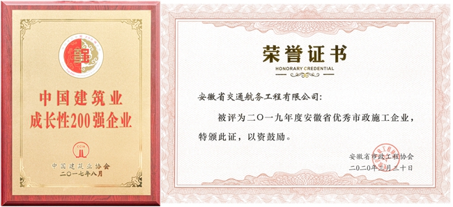 中國建筑業(yè)成長性200強企業(yè)、安徽省優(yōu)秀市政施工企業(yè)